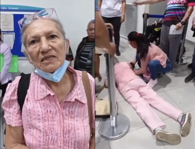 Segundos después de terminar su intervención, mientras otro usuario continuaba grabando, se escucharon gritos que alertaban que alguien se había caído. Era Cecilia Quintero, quien quedó tendida en el piso del dispensario ante la mirada de decenas de personas.
