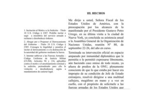 En su escrito, Leyva pide a las autoridades judiciales estadounidenses verificar si el presidente colombiano “incurrió en actos contrarios a las normas jurisdiccionales de ese territorio”. Sostiene que ningún jefe de Estado extranjero puede hacer declaraciones que interfieran en la cadena de mando militar de los Estados Unidos o en su política interna.