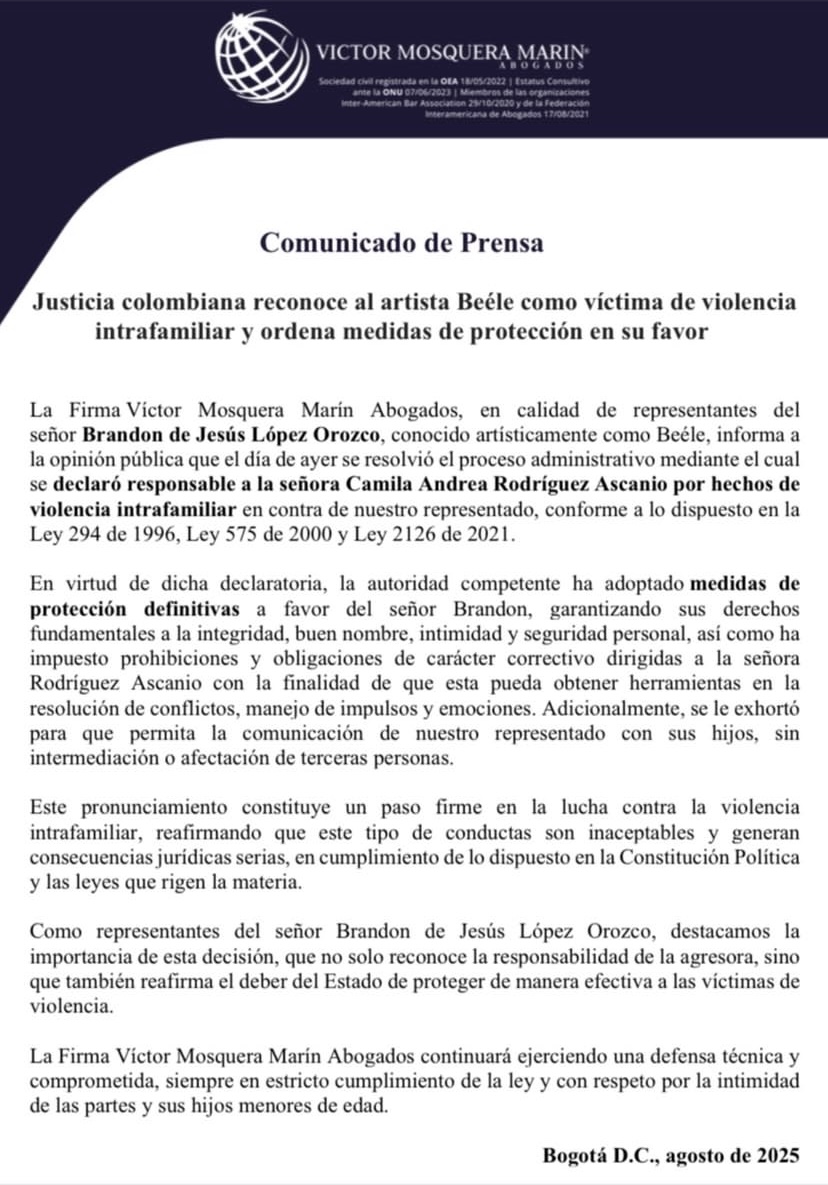 El fallo no solo reconoció a Beéle como víctima, sino que ordenó medidas de protección inmediatas. “Se declaró responsable a la señora Camila Andrea Rodríguez por hechos de violencia intrafamiliar en contra de nuestro representado”, señaló Víctor Mosquera, abogado del cantante, en un comunicado.