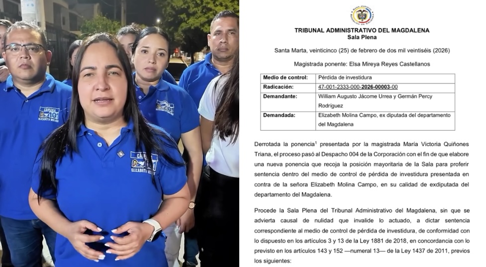 En un fallo de primera instancia emitido el 25 de febrero de 2026, la Sala Plena del Tribunal Administrativo del Magdalena decretó la pérdida de investidura de la exdiputada Elizabeth Molina Campo. La sentencia confirma que la exasambleísta vulneró la Ley 2200 de 2022 al suscribir contratos estatales dentro del año siguiente a la finalización de su periodo constitucional, incurriendo en una prohibición legal que acarrea la muerte política.