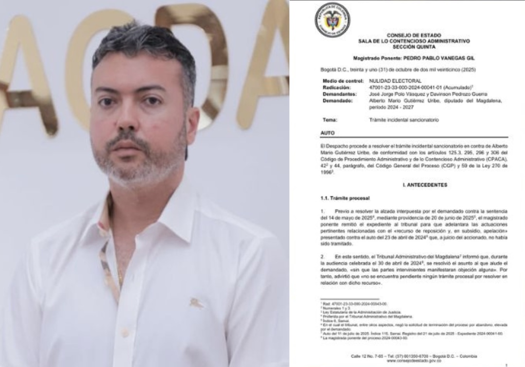 El Consejo de Estado sancionó al exdiputado del Magdalena Alberto Mario Gutiérrez Uribe con una multa equivalente a cinco salarios mínimos legales mensuales vigentes, tras determinar que sus actuaciones procesales ocasionaron retrasos injustificados en un proceso de nulidad electoral.