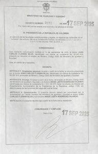 El Gobierno Nacional confirmó este 17 de septiembre la renuncia de Juan Carlos Florián Silva al Ministerio de Igualdad y Equidad, decisión adoptada por el presidente Gustavo Petro mediante el Decreto 0992.