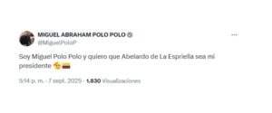 El congresista también utilizó su cuenta en X para ratificar su decisión: “Soy Miguel Polo Polo y quiero que Abelardo De La Espriella sea mi presidente”.
