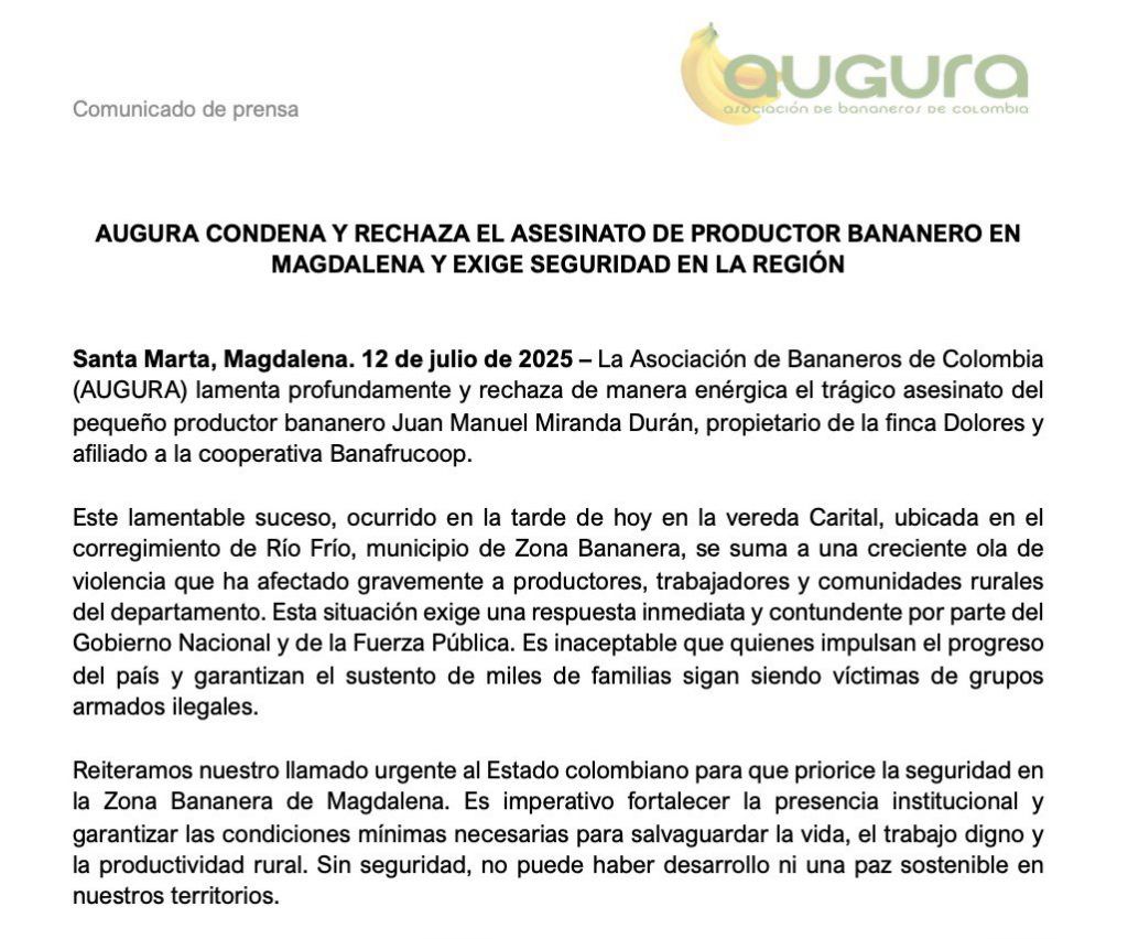 Tras el asesinato, la Asociación de Bananeros de Colombia (Augura) emitió un comunicado en el que rechaza el doble homicidio y exige al Gobierno Nacional mayores garantías de seguridad para los trabajadores del campo.