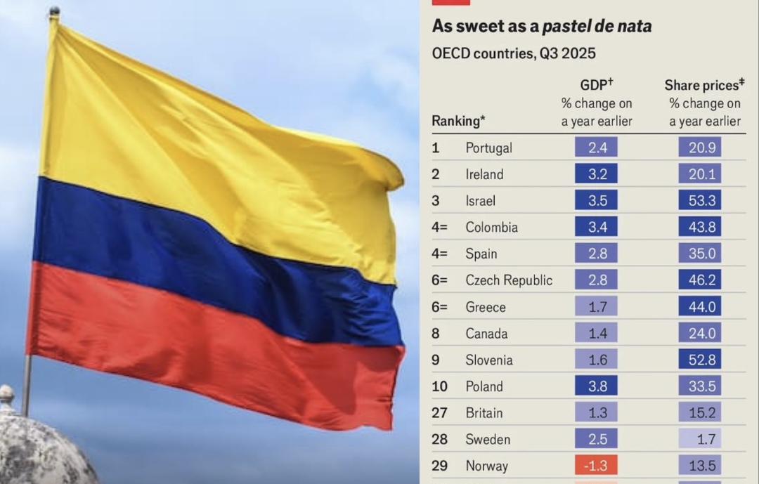 Colombia fue ubicada en el cuarto lugar del ranking de desempeño económico de 2025 publicado recientemente por la revista británica The Economist, una medición que evalúa a 36 países a partir de indicadores como crecimiento del Producto Interno Bruto (PIB), mercado accionario, empleo e inflación, y cuyos resultados fueron destacados públicamente por el presidente Gustavo Petro.
